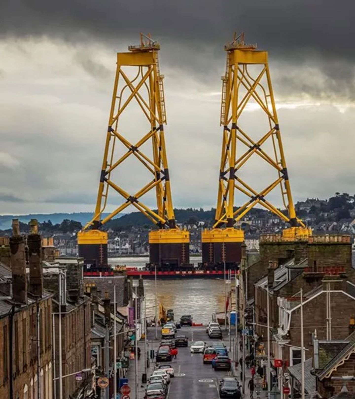 Her er samme bilde som i toppen av artikkelen. Det viser mer av de enorme dimensjonene. Fundamentene fraktes på lekter ut til vindparken Seagreen. ( Foto: Ken le Grice / SSE Renewables)