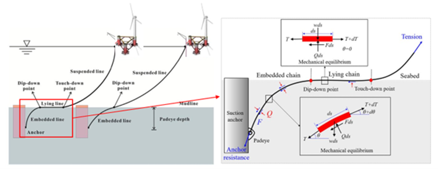 - Hovedoppgave 2 – Beregne geometrien til ankerlinene fra havbunnen til koblingen til sugeankerene ved hjelp av tradisjonelle grenselikevektsligninger. Disse beregningene gir linjekrefter og helningen ved koblingspunktet. Beregne nødvendige dimensjoner (diameter og penetrasjonsdybde) til sugeankerene for et gitt jordprofil.