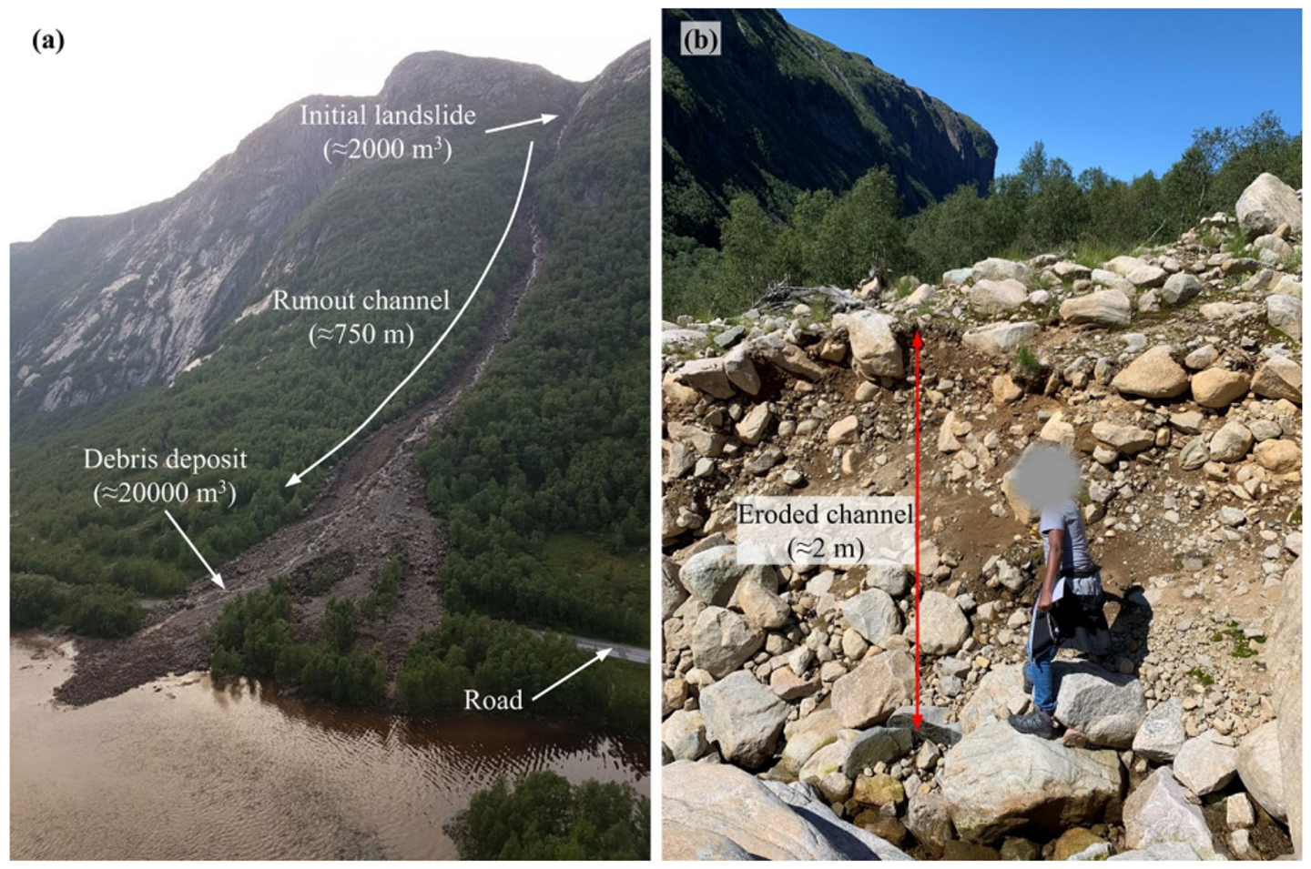 Figur 1. (a) Hunnedalen flomskred; (b) Erosjon av kanalen. (hentet fra Vicari, H., Tran, Q.A., Nordal, S. Thakur V. MPM-modellering av debris flow entrainment og interaksjon med en oppstrøms fleksibel barriere. Jordskred (2022).
