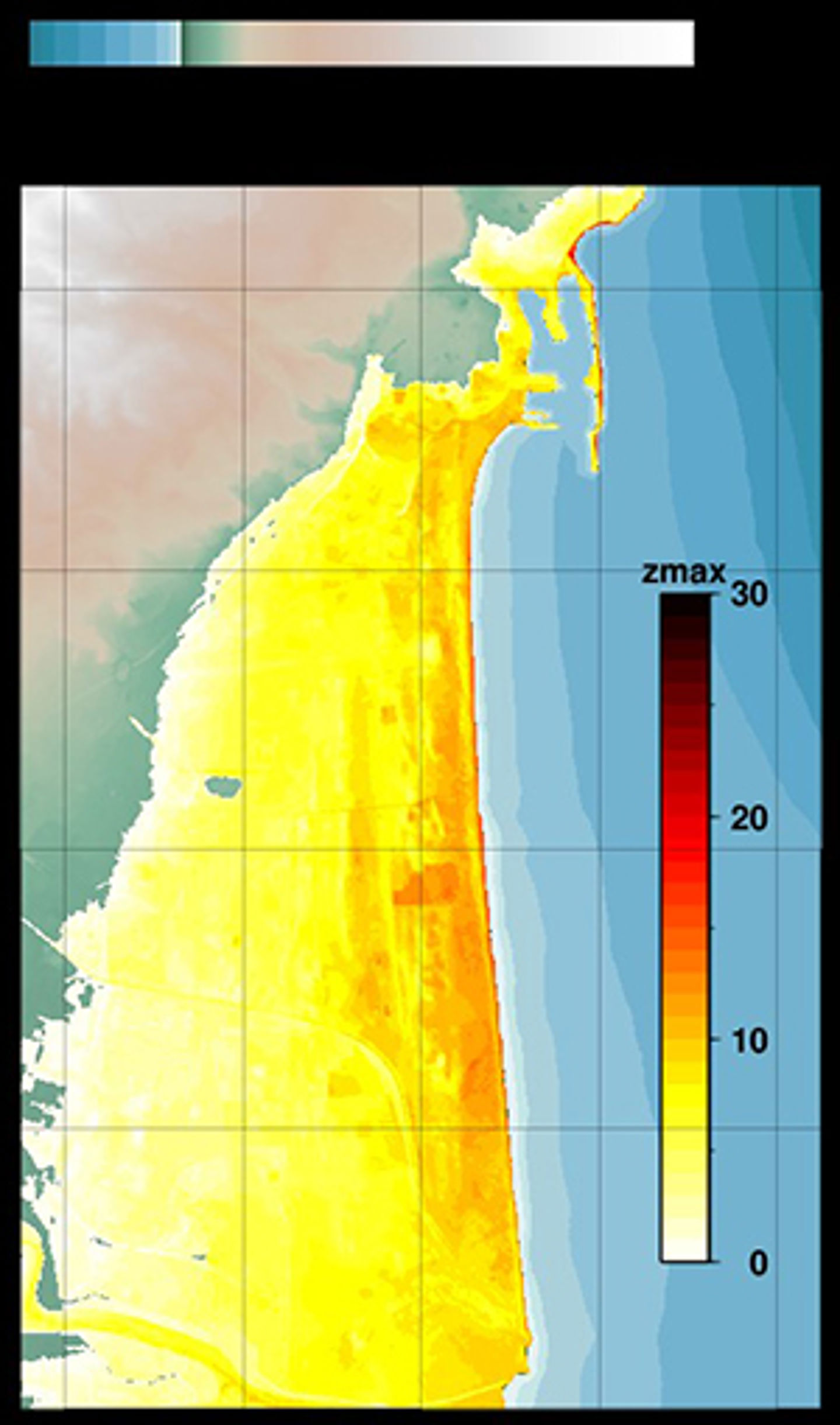 The tsunami propagation calculations are computed on denser and denser grids as we approach the shore and, given a sufficiently accurate digital model of the height of land near the town of interest, we can calculate the flow depth, maximum height, and momentum flux at every point of interest. With such inundation maps calculated for every earthquake scenario, we can calculate the hazard curve by combining the simulation results with the probabilities of occurrence for each of the scenarios.
