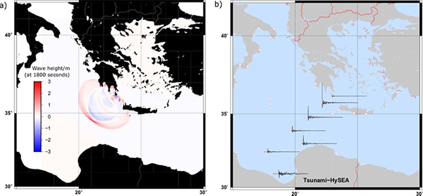 Numerical simulation of a tsunami generated by a subduction earthquake in the Hellenic Arc (Greece) using the HySEA program. We see (a) a snapshot of the water height in meters 30 minutes after the time of the earthquake and (b) readings from virtual ocean buoys measuring the height of the wave with time at different locations.