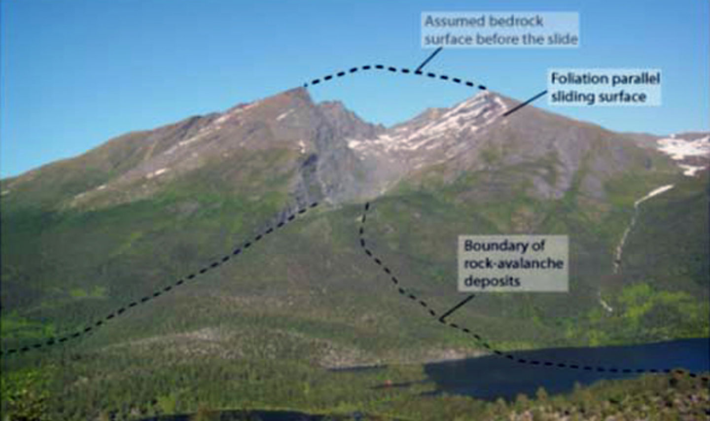 View towards the slide scar and the deposits of a large rock avalanche in Balsfjord, Troms, Norway. The distinct slide scar demonstrates that the failure occurred along the foliation planes. The deposits show that the volume is more than 100 million m3, with a run-out distance of 5 km.