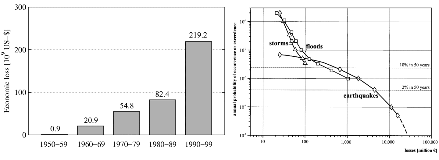 Figure 2. (left) Global economic losses per decade in billions of US-$, normalized to the year 2000 value (Munich Re) and (right) risk curves due to storms, floods, and earthquakes for the city of Cologne, Germany. The data considers losses at buildings and in the sectors private housing, commerce, and industry for the year 2000 (courtesy of G. Grünthal, 2004). When comparing earthquake risk with other natural risks it is informative to see from Fig. 2 that, at low probabilities, the earthquake risk is far above the risk from other natural hazards (even in low-seismicity regions like e.g., Germany).