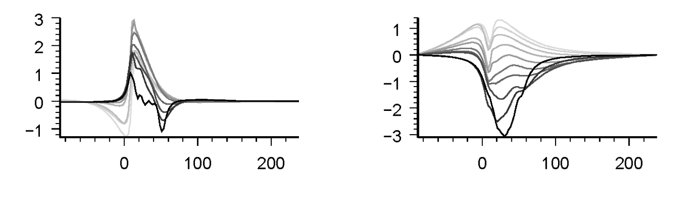 Figure 10. Influence of change of subduction angle from 0° to 90°; left: vertical displacement, right: horizontal displacement, light colour: steep subduction angle, dark colours: shallow subduction angle.