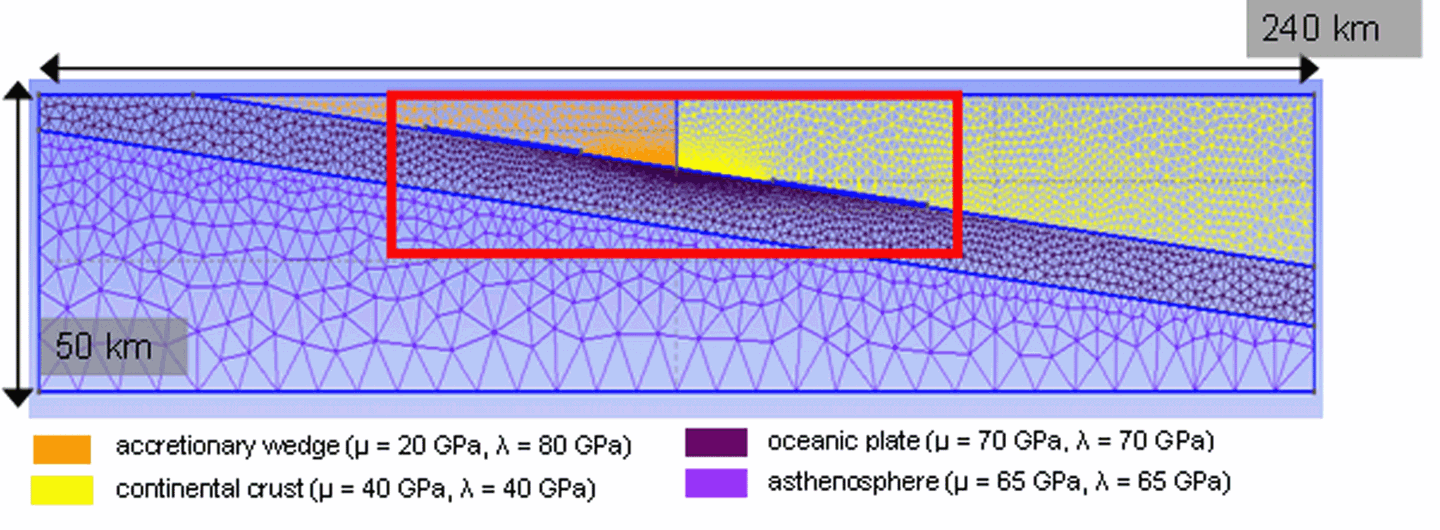Figure 9. Inhomogeneous FEM mesh used to calculate seafloor displacement resulting from slip on earthquake faults; mesh is subdivided to represent accretionary wedge, continental crust, oceanic plate and asthenosphere
