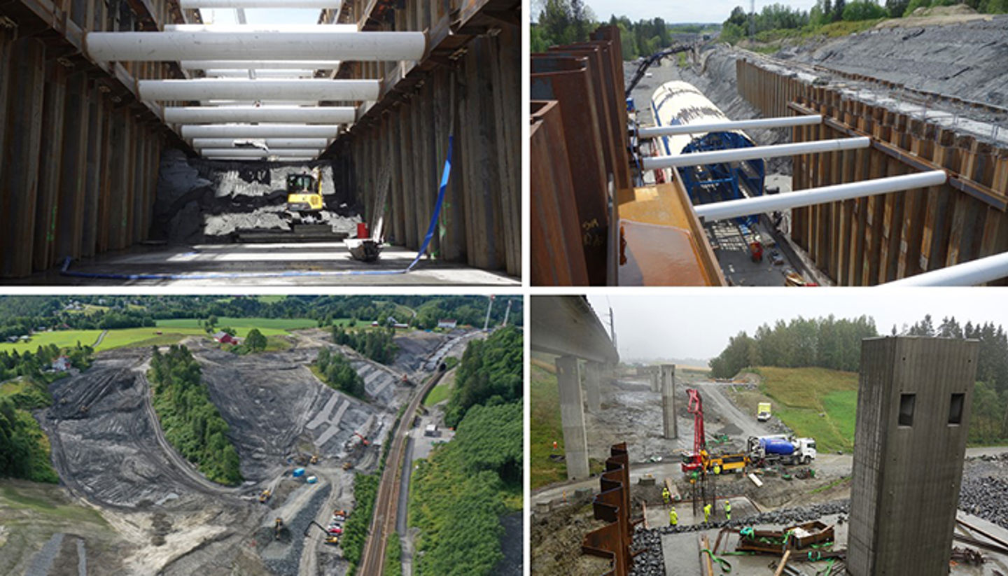 The construction pit for the new track on the Wergeland tunnel has been one of the challenges on this stretch. The tunnel is located only a few meters from the existing Eidsvolltunnelen. While the existing tunnel was mainly excavated, secured and cast directly in the clay as a soil-mass tunnel, the new tunnel is being built in an open construction pit. The excavation (main picture at the top) is approx. 400 m long and at the most 22 m deep, and the design resulted in up to four bracing levels. The walls are braced with Ø406 to Ø813 mm steel pipes with center distances of 4.5 and 5 m. There are approx. 4 to 6 m distance vertically between the bracing levels.