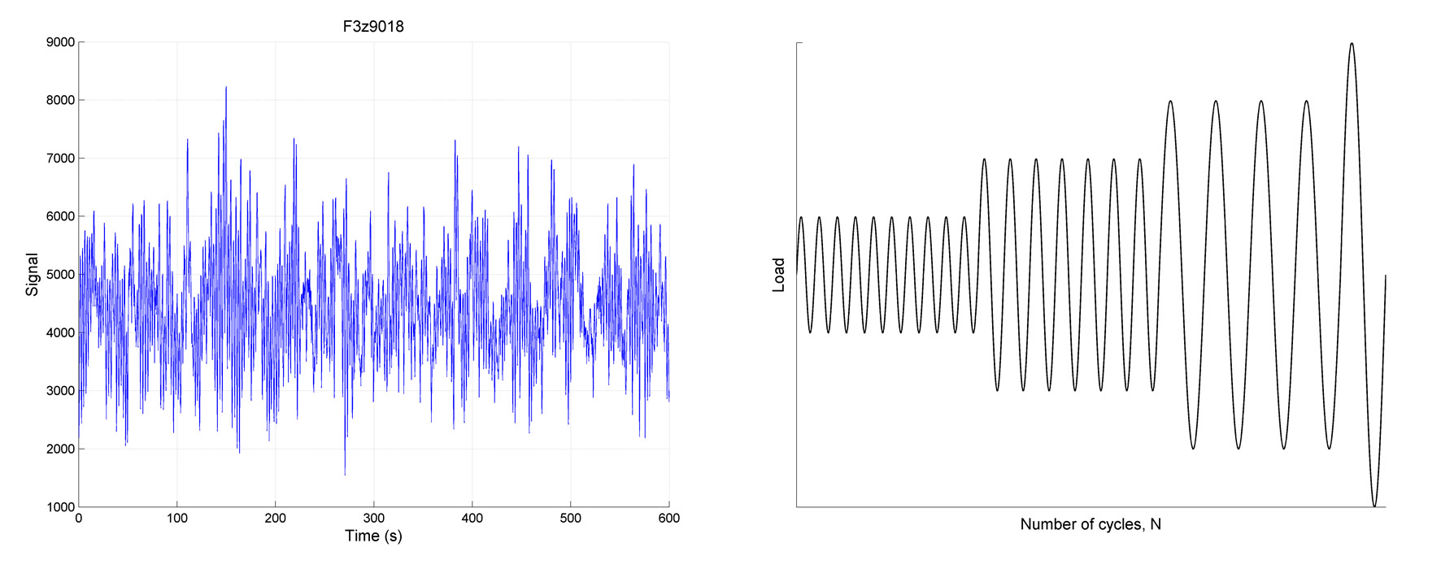 The new method has been tested on a simulated load time series and the result compared with that obtained from a rain flow analysis on the same load time series. The comparison shows that the deviations between the two methods are considerable, in terms of both the identified number of cycles in the time series and the calculated equivalent number of cycles. Correct definition of load cycles is very important for design of the structure and foundation.