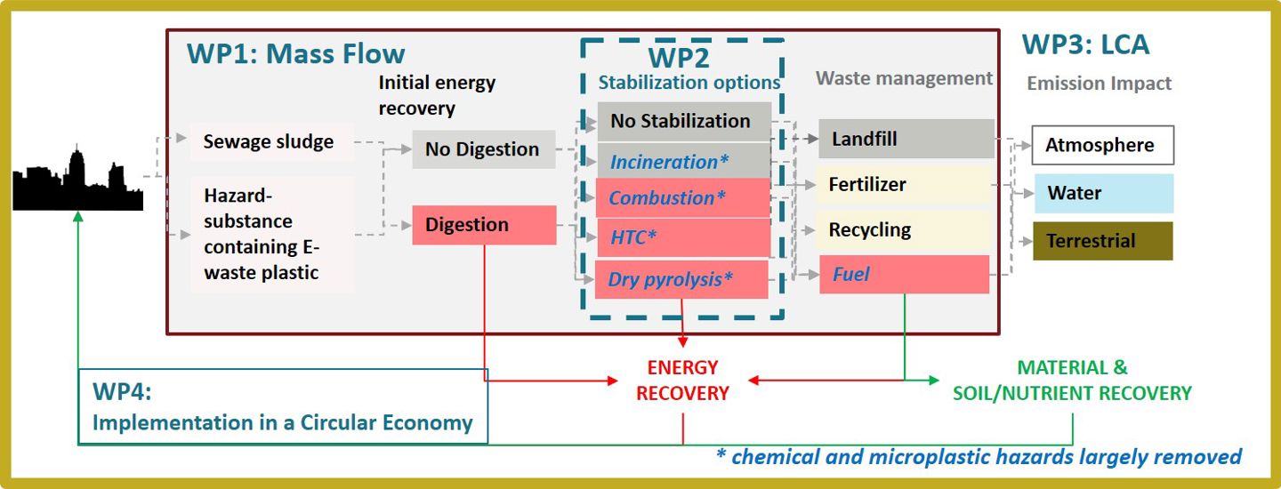 This issue especially comes to the fore with two types of wastes: sewage sludge and e-waste plastic. These hold tremendous circular potential for nutrient recycling, green energy and as a replacement source of raw materials. This potential, however, is not realized due to elevated levels of hazardous substances. Using raw sewage sludge as fertilizer is problematic due to exposure through food and water ways affected by agricultural run-off; recycling e-waste plastic is problematic due to recycling hazardous substances and environmental emissions during recycling.