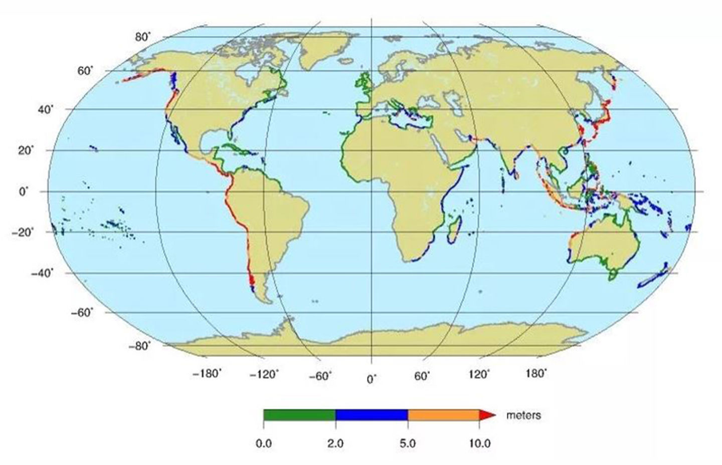 The methodology consists of a combination of probabilistic tsunami hazard assessment (PTHA) and GIS analysis for providing tsunami inundation maps (a static map of the 500-year return period global tsunami hazard data is shown in the figure below).