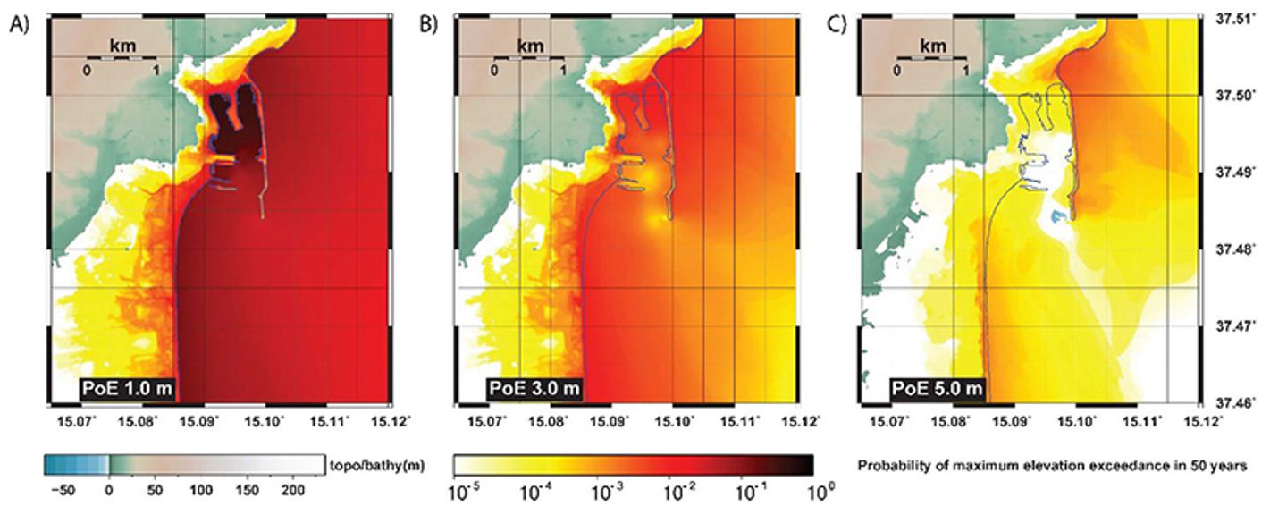 Probabilistic hazard maps, examples of which are displayed below (Figure 1), may be of importance for insurance evaluations, emergency planning (e.g., evacuation routes), coastal engineering (planning constraints), and civil protection (hazard zonation for emergency planning).