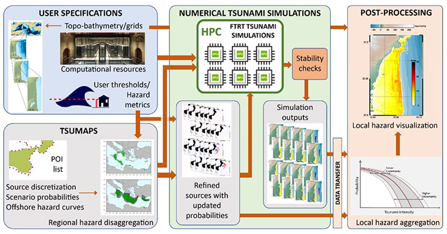 Figure 3: A workflow for local Probabilistic Tsunami Hazard Analysis taking as input user-supplied topo-bathymetric grids and specified hazard metrics. The underlying earthquake models (including probability of occurrence) is the TSUMAPS1.1 model. The numerical tsunami simulations are carried out at external HPC centers, and the hazard results are summarized and visualized for the user.