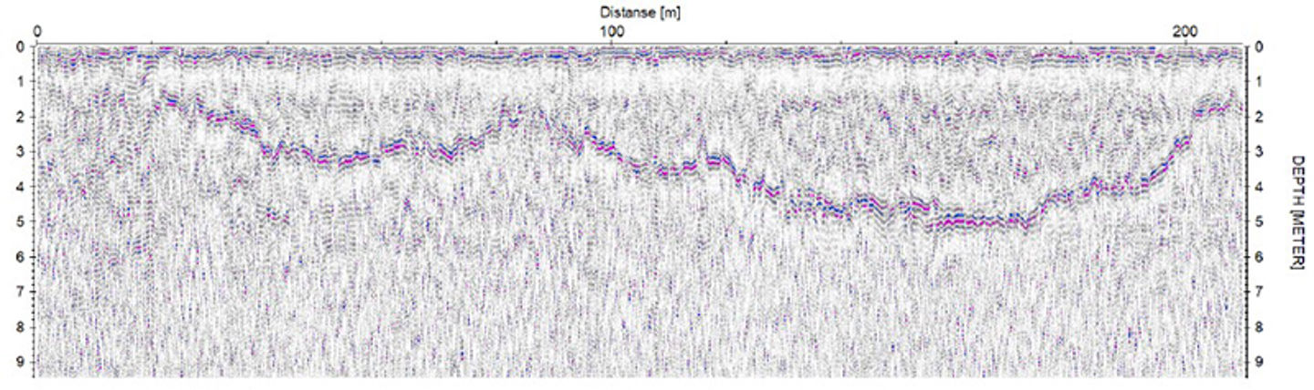 Radargram fra et myrområde i Sør-Norge. Det ble observert berg i hver ende av profilet (granittisk gneis), og reflektoren som er synlig igjennom profilet tolkes som overgangen til berg/faste masser. Hastigheten i løsmassene er anslått ut fra myras ledningsevne og permittivitet.