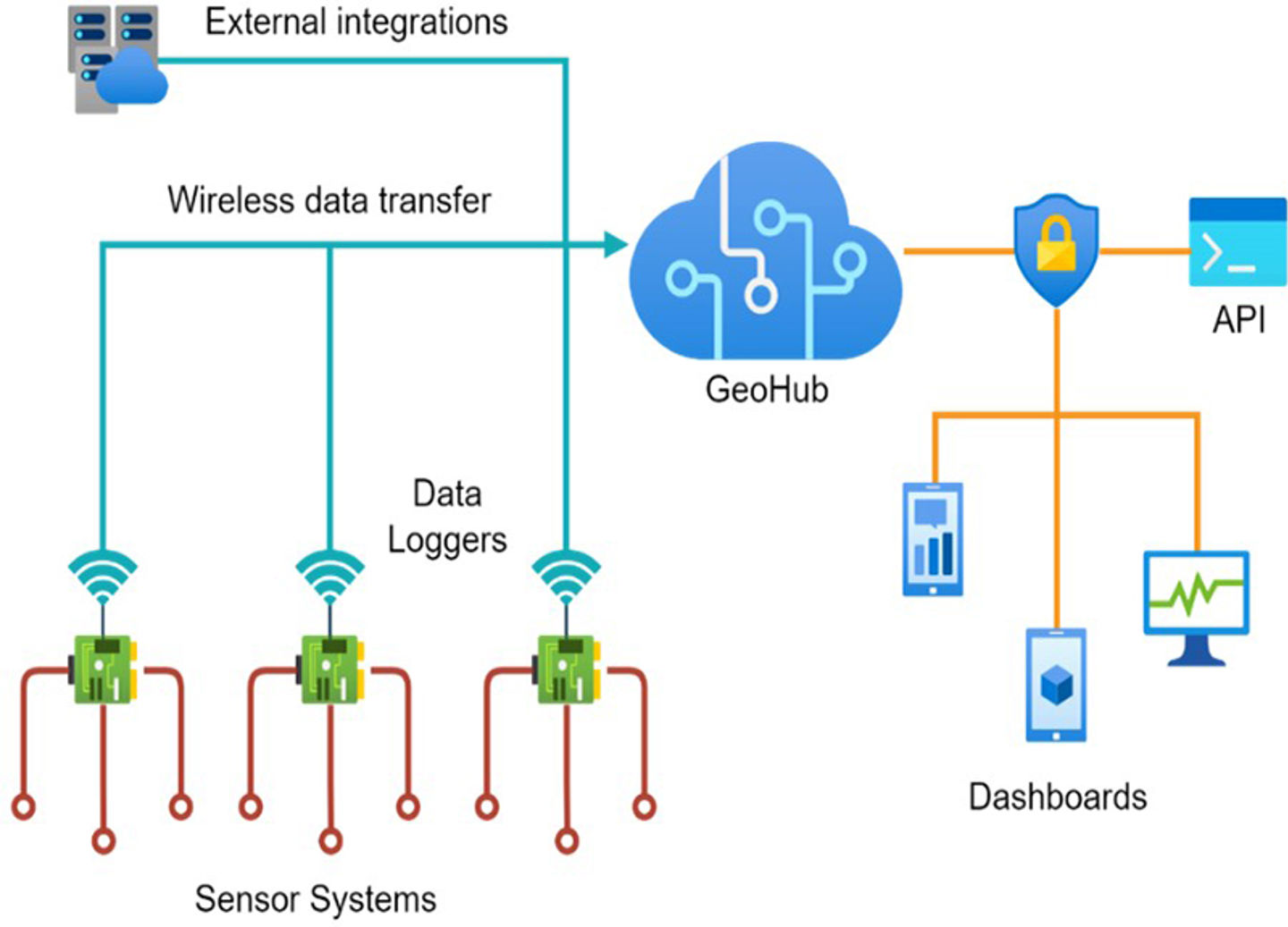 Målesystemene er typisk koblet til lokale dataloggere som overfører data trådløst (via IoT-modem, radio, 4G eller Wifi) eller via fiberkabel til vår skybaserte løsning (NGI GeoCloud[EP1] ), med presentasjon av data tilgjengelig via vår webbaserte plattform "NGI Live".