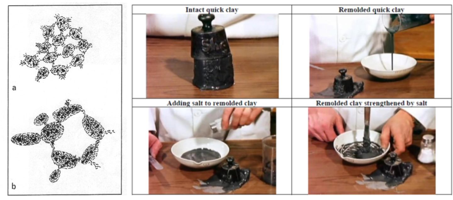 Fra venstre: - Skjematisk bilde av leire sedimentert i ferskvann (a) og i saltvann (b), (efter Pusch, 1970. Fra SGI - Kvicklera – bildning och egenskaper – litteraturstudie. Karin Rankka, 2003) / Bildeserie med kvikkleire: belastning, omrørt leire, tilsetning av salt, og fast leire etter at saltet er blandet inn i porevannet.