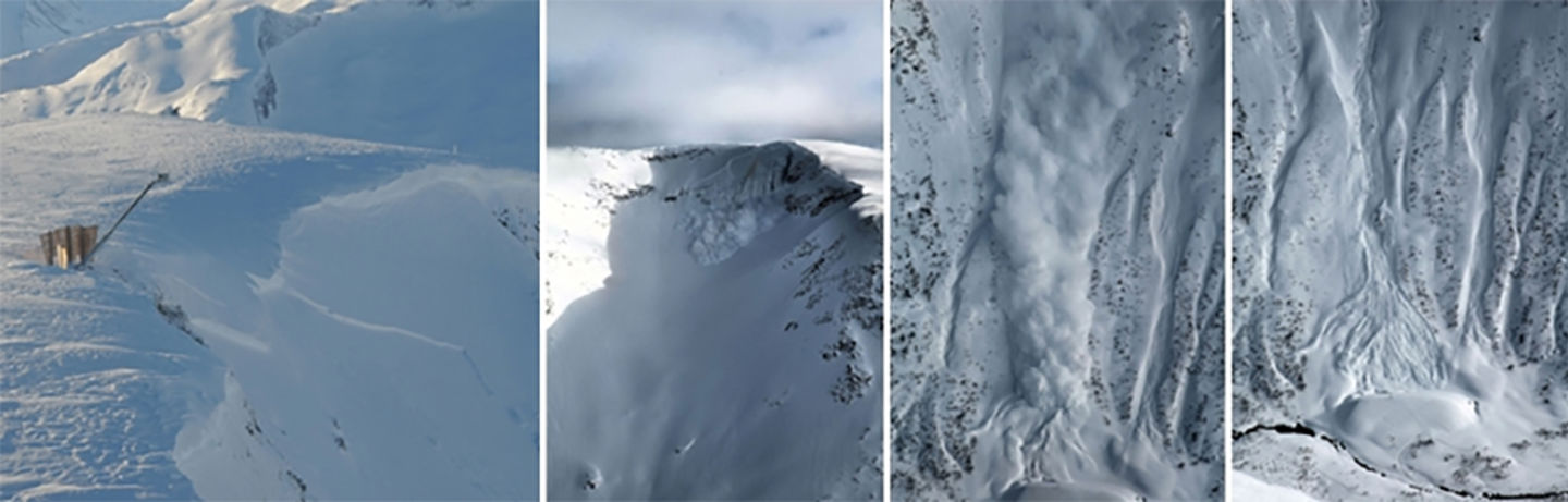 Fra venstre: Utløsning med detonasjon av sprengstoff - skredet starter ved at skavlen løsner - skred og skredsky på vei nedover skredbanen - etter at skredet har stoppet (ved skredvollen i bunn av skredbanen)