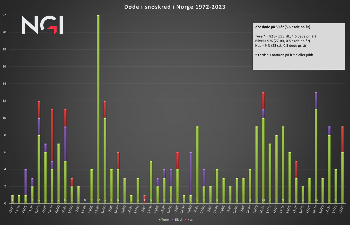 Snøskredulykker i Norge med død siden 1972. Vinteren 85/86 med 22 døde er som følge av tragedien i Vassdalen 5. mars 1986, under NATOs vinterøvelse Anchor Express, da en tropp med ingeniørsoldater ble tatt av snøskred og 16 soldater omkom (https://no.wikipedia.org/wiki/Vassdal-ulykken)